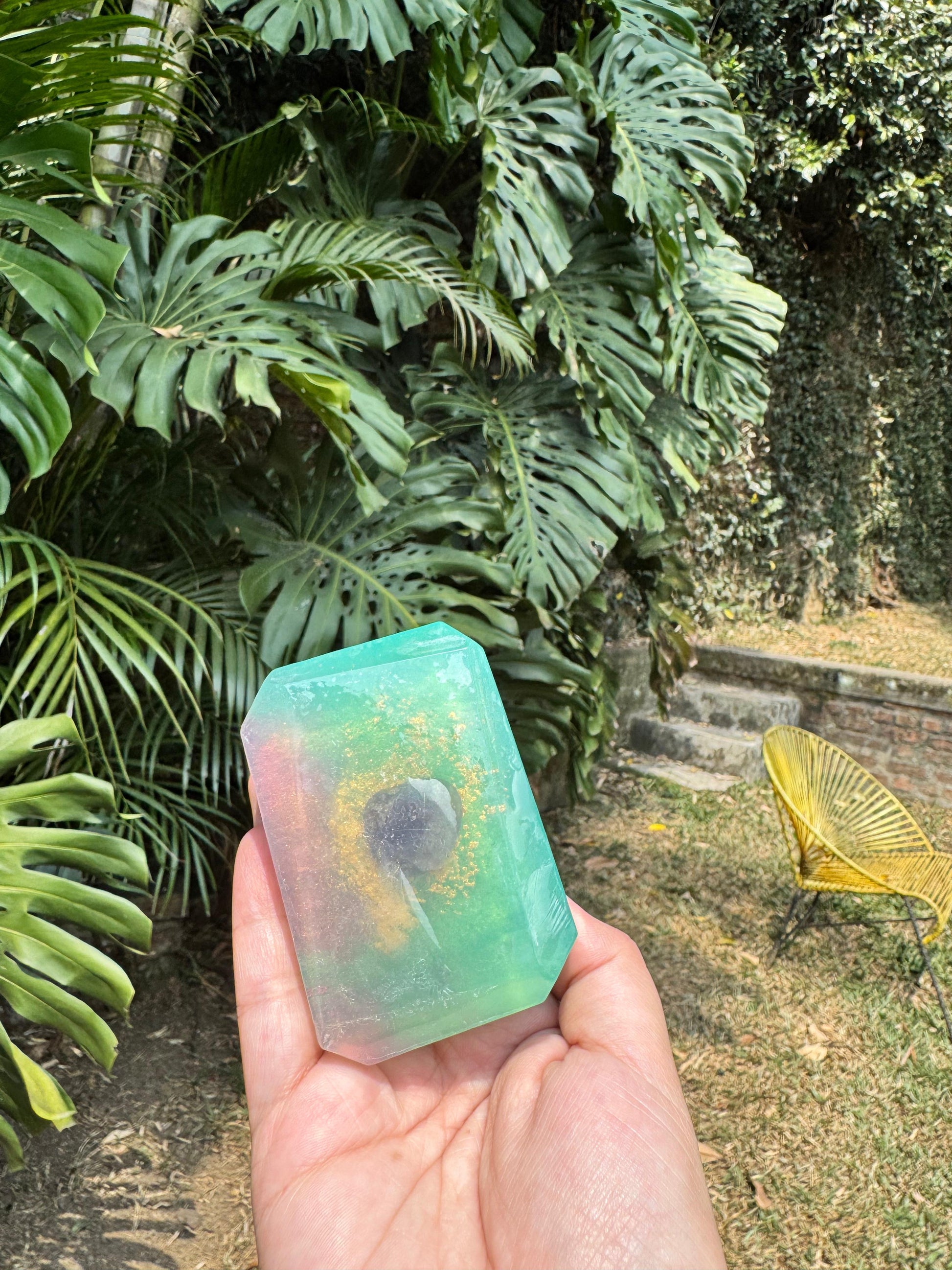 Cada barra está elaborada artesanalmente, infusionada con amor y con un cuarzo amatista incrustado, que queda contigo para seguir acompañándote después del baño.